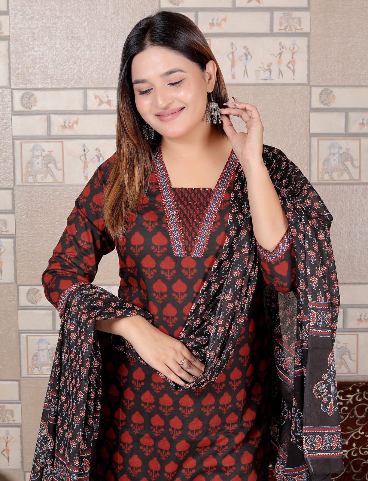 Turn heads with this rich maroon and black printed cotton suit set by Lamenda – a blend of timeless prints and flattering fit. Paired with a flowy mul dupatta and minimal neckline detailing, this 3-piece set is perfect for everyday elegance with zero compromise on comfort. ✨ Traditional meets modern simplicity – your wardrobe essential.