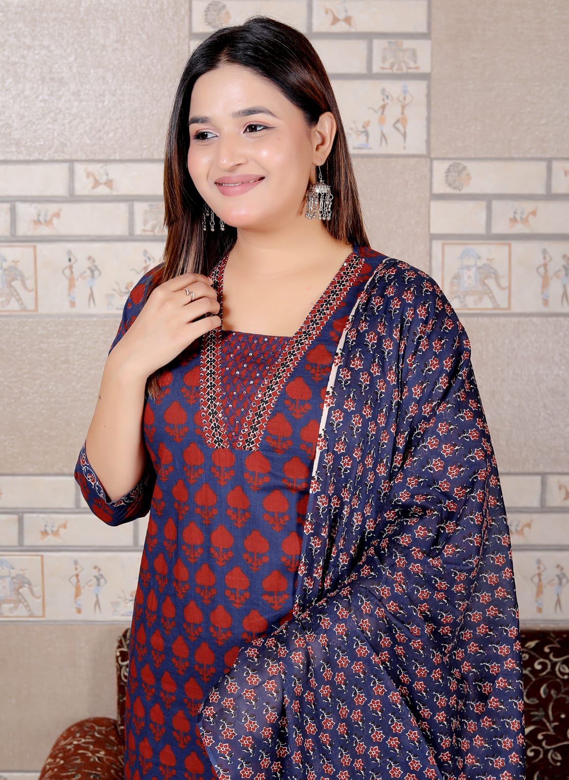 Stay stylish and comfortable all day long with this beautiful Maroon & Blue Printed Cotton Suit Set from Lamenda Ethnic Wear. Made from soft, breathable cotton, this outfit is perfect for daily wear or small festive gatherings. The kurta features elegant prints and a pretty embroidered neckline, paired with matching pants and a flowy printed dupatta that completes the look perfectly.